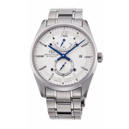 Our premier ORIENT STAR features this elegant 40mm stainless steel mechanical watch, showcasing a beautiful case and lugs. Completing the watch’s distinguished aesthetic is dial, sub-dials for power reserve and seconds, stylish hands and a hand-wound crown with automatic self-winding functionality. Matching its case, the hour markers give this exquisite watch the perfect touch of sophistication. The impeccable craftsmanship of the case frames the meticulous movement of the watch, protected by sapphire crystal. Roman numerals are tastefully placed at the 12 o’clock position. Anti-reflective coating glass delivers increased visibility, suppressing reflection while adding improved scratch and stain resistance. The timepiece supports a continuous running time of 50 hours and water resistance of 50 meters. This contemporary timepiece is housed in a beautifully crafted matte black box featuring black suede inside.
